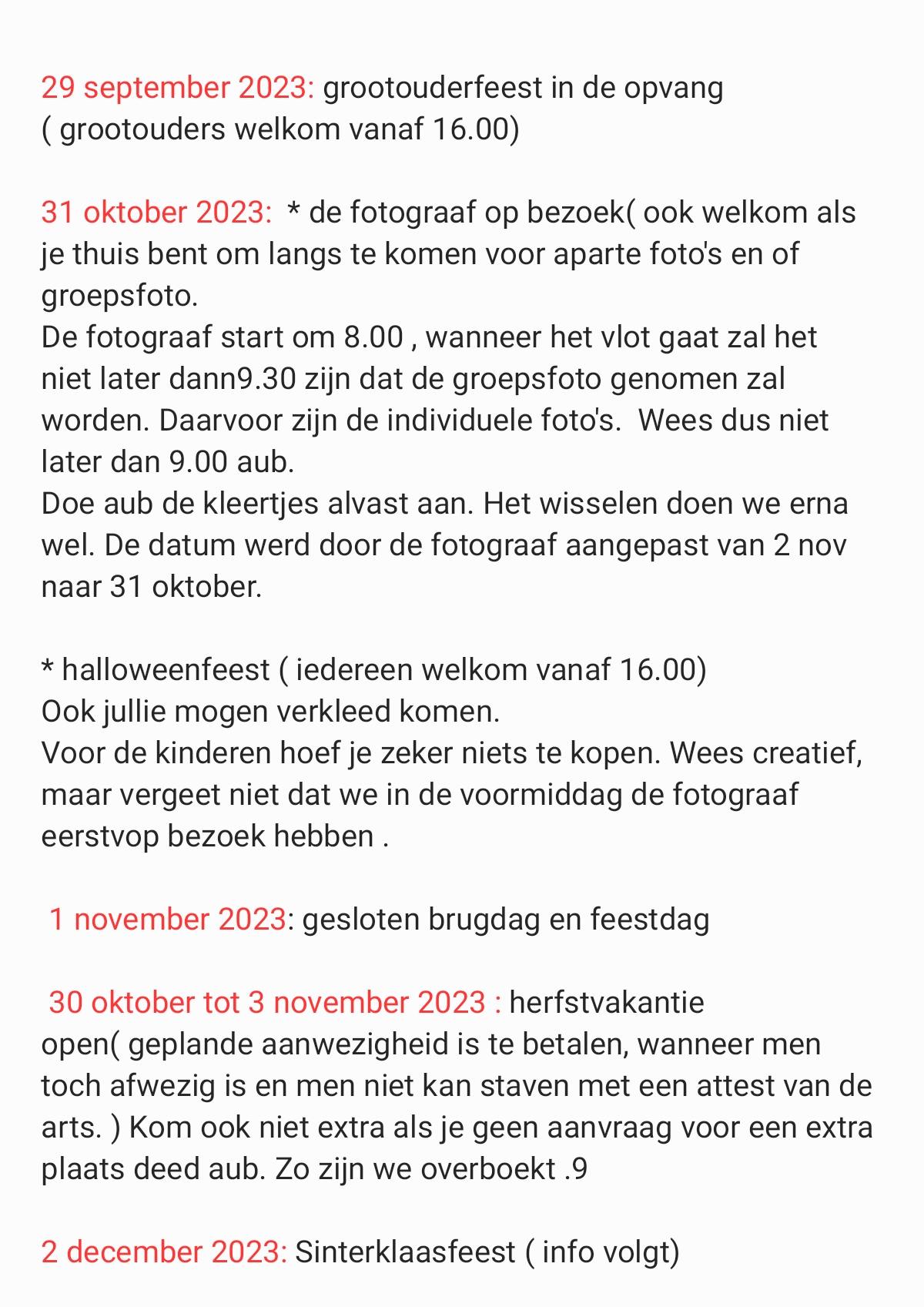 Wanneer uw kindje niet zou komen gelieve te verwittigen voor acht uur 's morgens. U mag zowel bellen als een tekstbericht versturen naar 0497/46 19 45.
